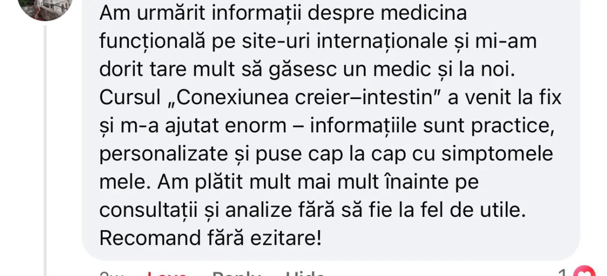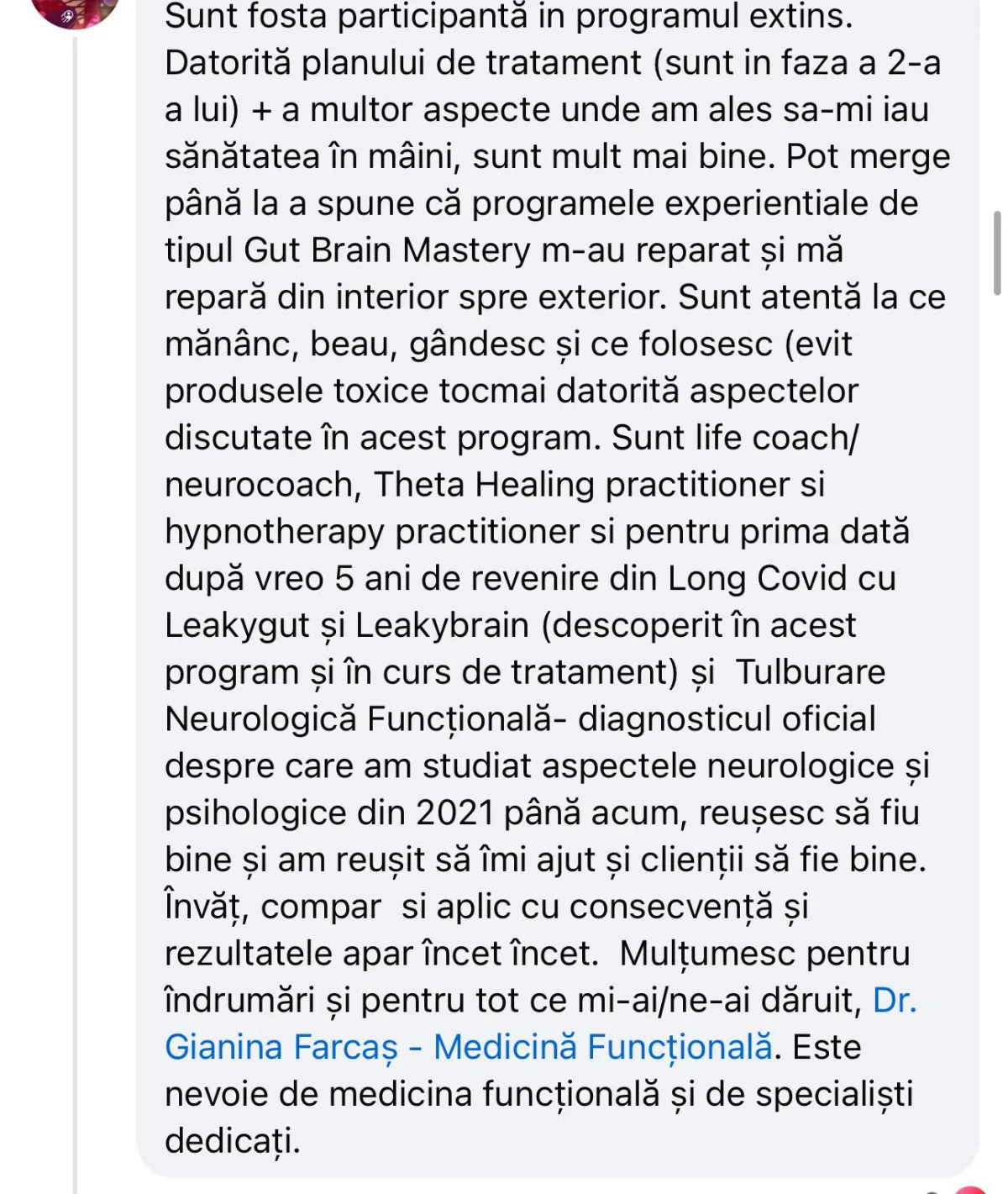 M-am specializat în medicina funcțională la Institutul de Medicina Funcțională din California, unde am descoperit impactul pe care microbiota o are asupra stărilor emoționale și a sistemului imunitar.